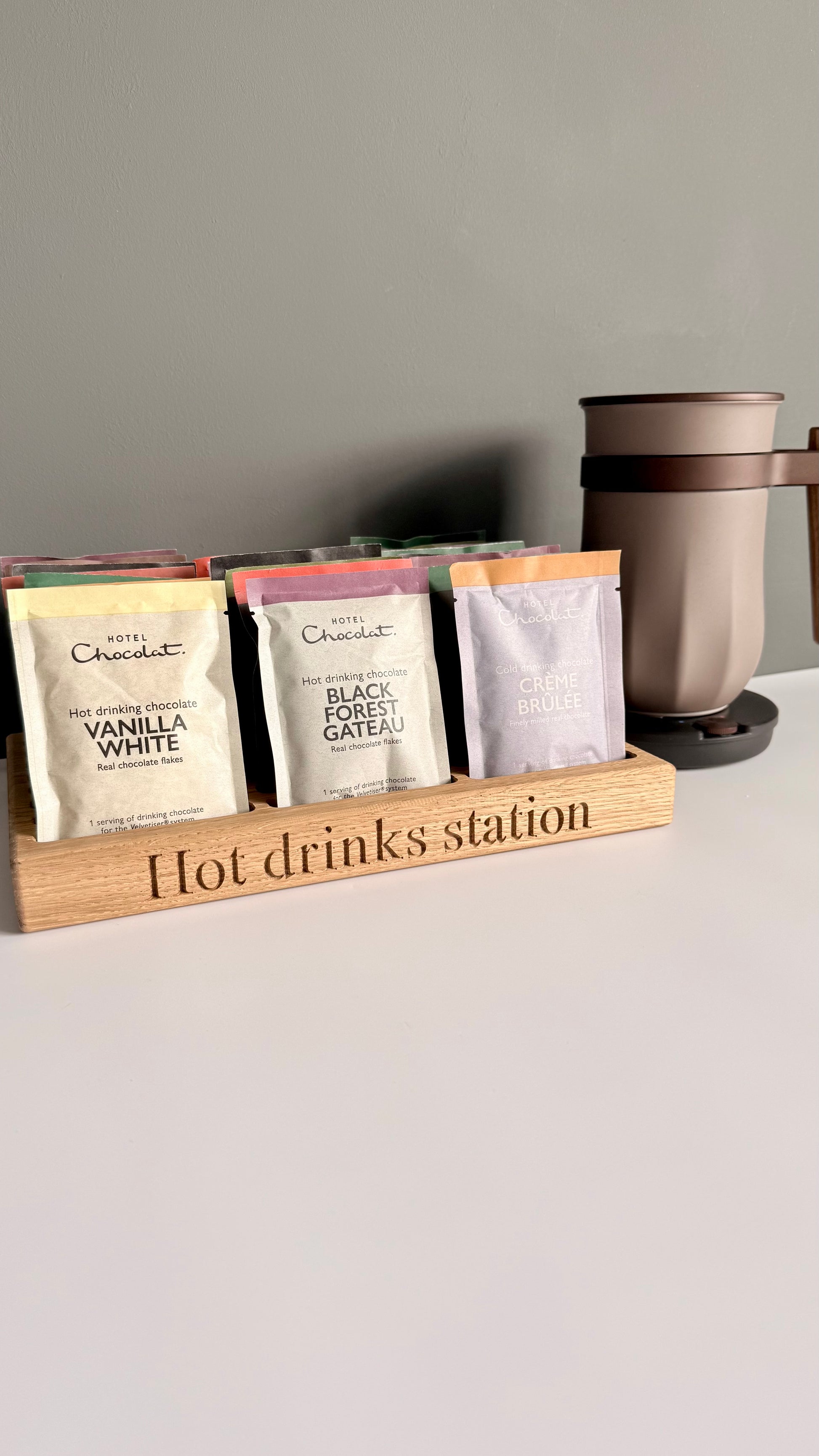 Transform your hot chocolate station with our handcrafted solid oak sachet holder – the perfect home for your Hotel Chocolat Velvetiser sachets. Designed with both form and function in mind, it keeps your flavours neatly organised while adding a stylish, personalised touch to your kitchen.